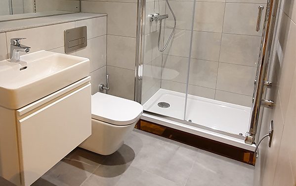 866 bathroom pods will be manufactured for the development including main bathrooms with bath/shower and en-suite pods with showers. All pods will be manufactured floorless enabling a continuous floor finish throughout each of the 520 apartments. Each pod features large grey landscape tiles with wall hung sanitaryware and large mirror and towel rail.