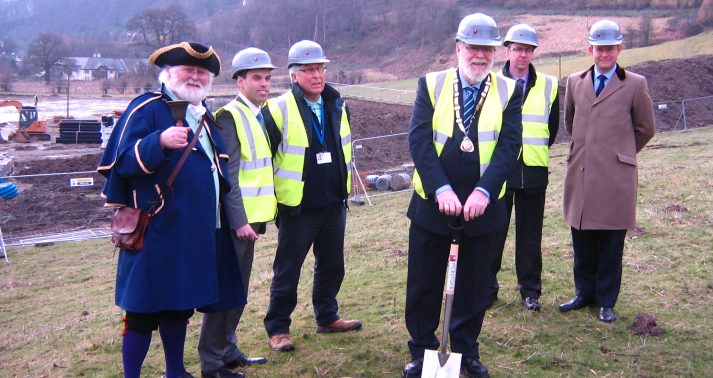 A number of key stakeholders met at the Climedw site to see Llangollen Mayor, Councillor Robert Lube carry out the cutting of the turf. Amongst those that attended was Ken Skates, Clwyd South AM, Llangollen Town Crier, local councillor Stuart Davies, Paul Holden, MD of Dobson & Crowther and Nick Scott CEO of J-Ross Developments Ltd.