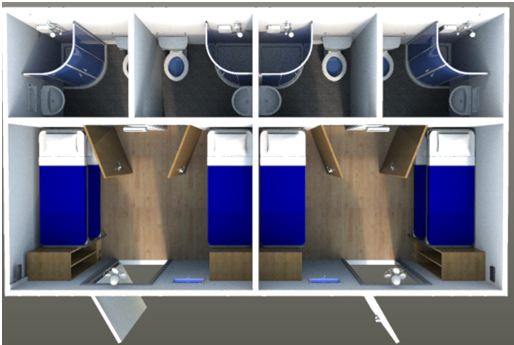 Each unit is 7m long, 3 m high and over 4m wide and contains two rooms. Each room features two bunk beds and two en-suite bathrooms making it suitable for miliatry use. The configuration which was designed according to the client’s specifiaction, accommodates four soldiers per room and eight per unit.