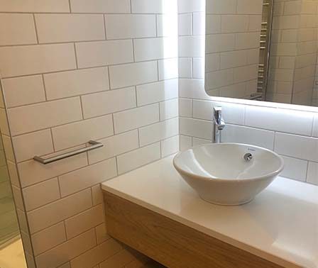 The pods are fully tiled with white landscape tiles, have a round counter top sink upon a wooden counter, wall hung wc, large illuminated mirror and shower offering a modern feel in line with this hotel brand.